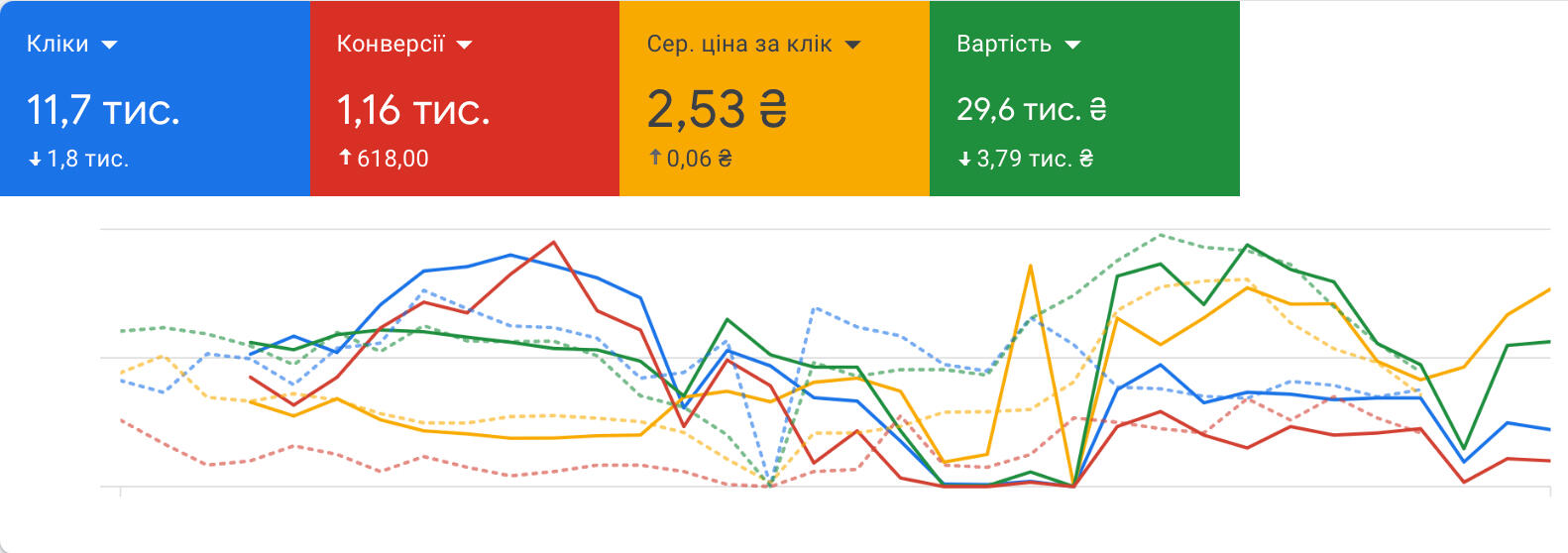 Були підключені розширення оголошень, та змінили структуру кампаній.